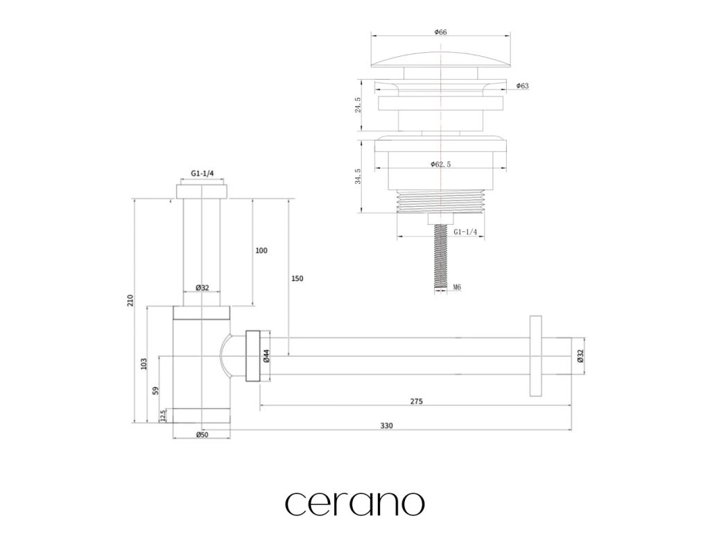 CERANO - Syfon umywalkowy - mosiądz - DN32 mm z odpływem klik-klak z przelewem - biały