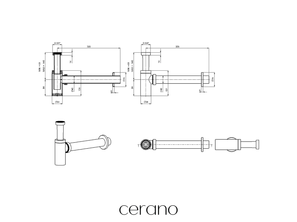 CERANO - Syfon umywalkowy - tworzywo sztuczne - DN40/300 mm - z odpływem click-clack - uniwersalny - tworzywo sztuczne - matowy biały