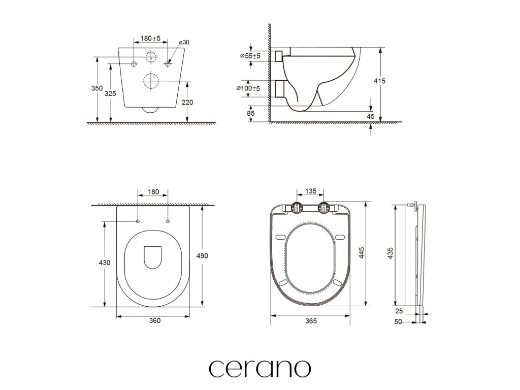 Podwieszane toalety Cerano są łatwe w montażu i, dzięki standardowym rozstawom montażowym, kompatybilne z modułami Cerano, a także innymi markami, takimi jak Geberit, Grohe, Alcadrain, Jika, Tece itp.