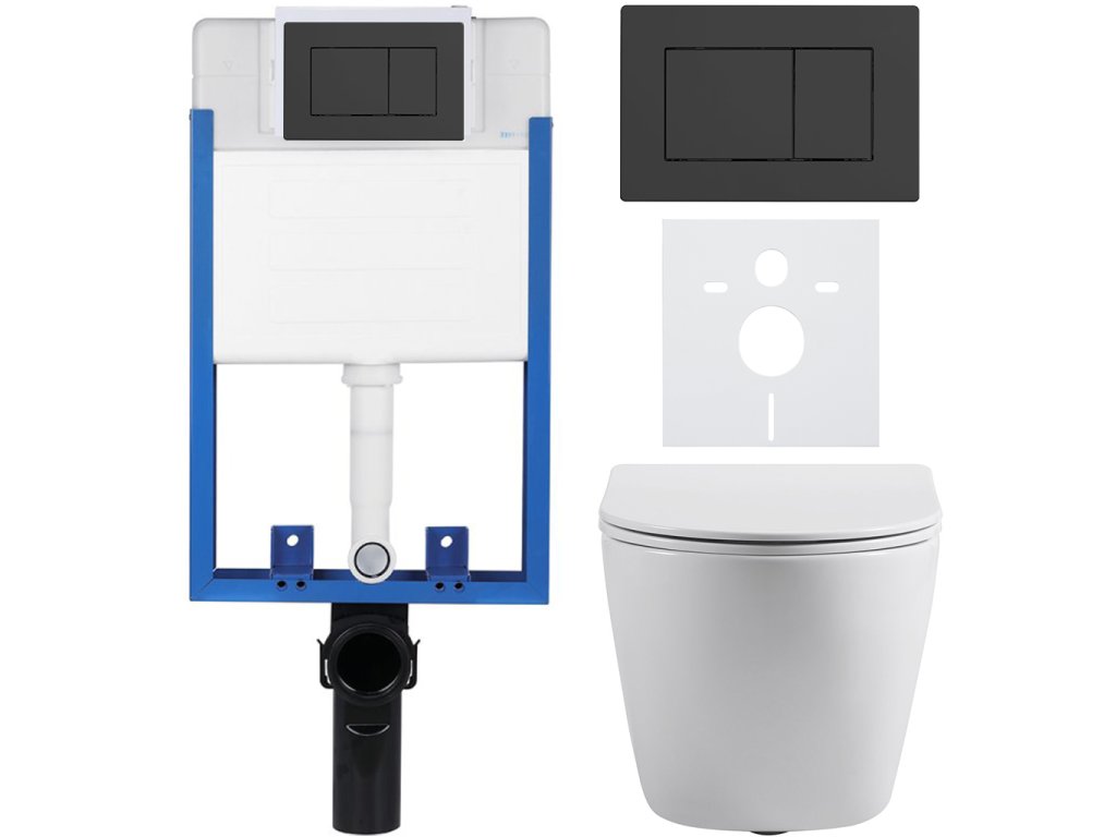 CERANO - Kompletny zestaw WC podtynkowy Lite/Cesso - połysk biały - Klasyczny przycisk WC, matowy czarny - do montażu na ścianie - 49x36 cm