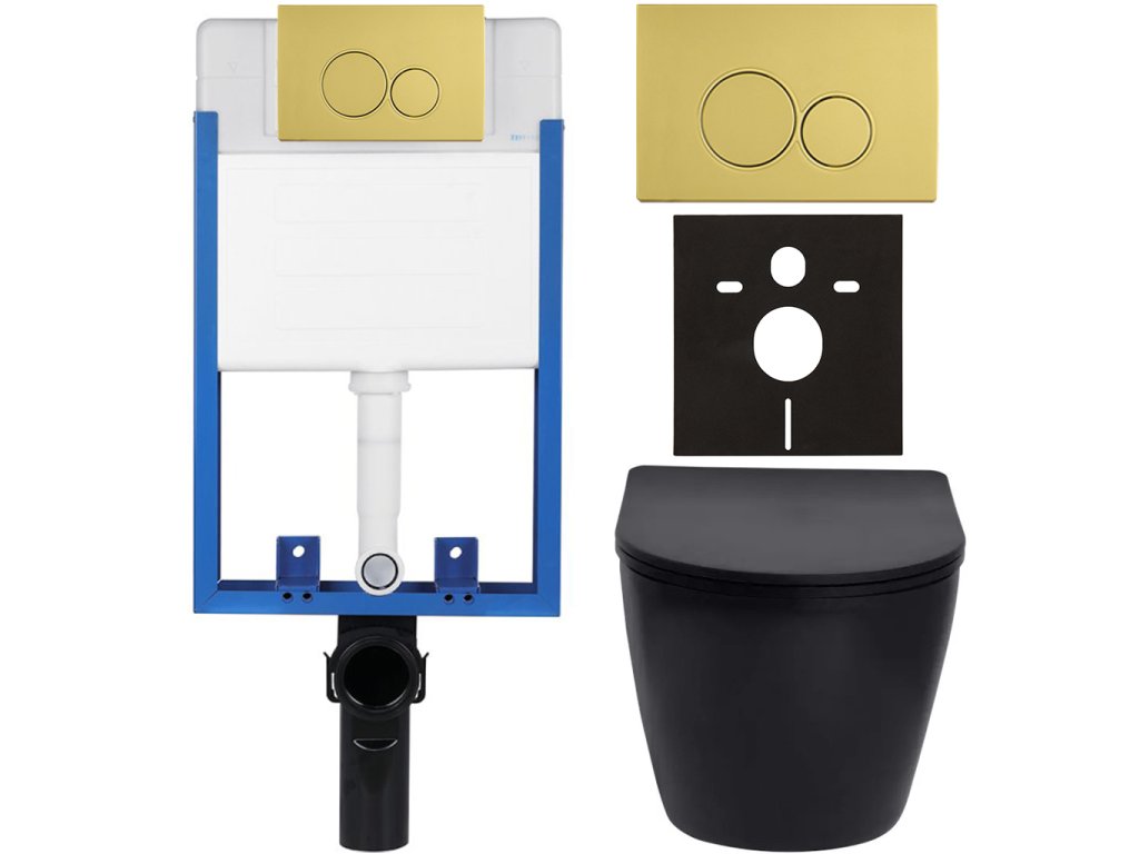 CERANO - Kompletny zestaw WC podtynkowy Lite/Verde - matowa czerń - Przycisk WC Duo, złoty - do montażu ściennego - 49x36 cm