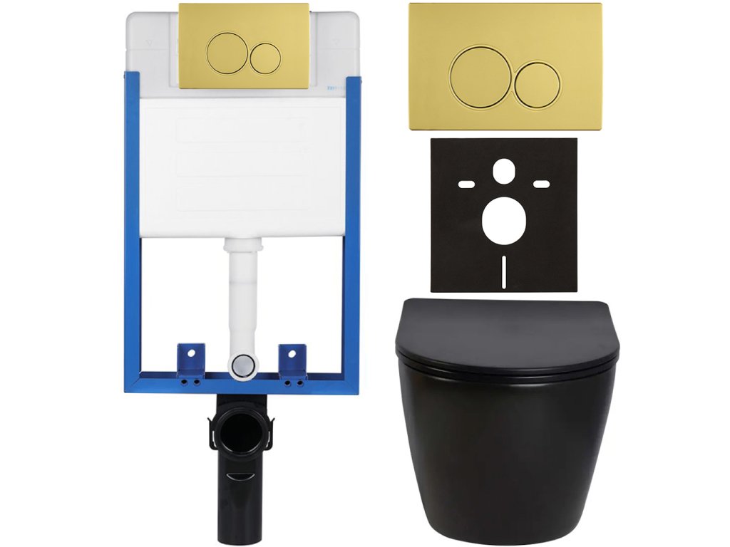 CERANO - Kompletny zestaw WC podtynkowy Lite/Verde - połysk czarny - Przycisk WC Duo, złoty - do montażu ściennego - 49x36 cm