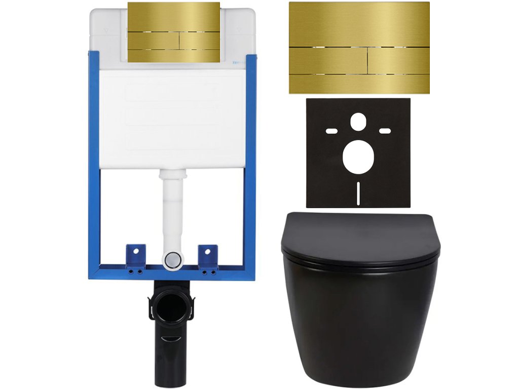 CERANO - Kompletny zestaw WC podtynkowy Lite/Verde - połysk czarny - Przycisk WC Line, złoty - do montażu ściennego - 49x36 cm