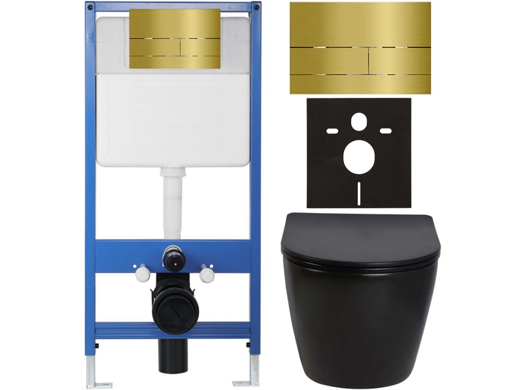 CERANO - Kompletny zestaw WC podtynkowy Lite/Verde - połysk czarny - Przycisk WC Line, złoty - montaż podtynkowy - 49x36 cm