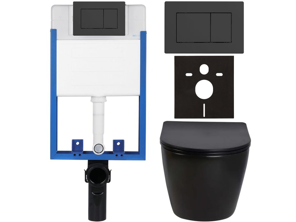 CERANO - Kompletny zestaw WC podtynkowy Verde - połysk czarny - Klasyczny przycisk WC, matowy czarny - do montażu na ścianie - 49x36 cm