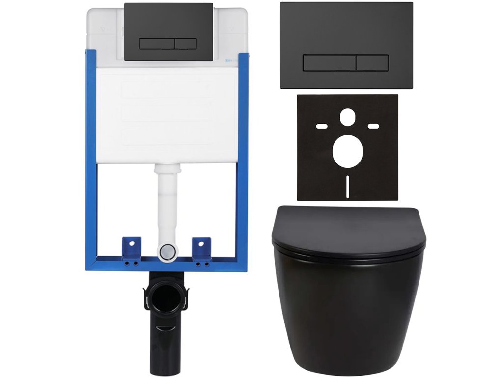 CERANO - Kompletny zestaw WC podtynkowy Verde - połysk czarny - Przycisk WC Slim, matowy czarny - do montażu na ścianie - 49x36 cm